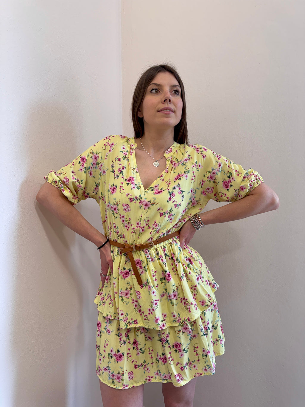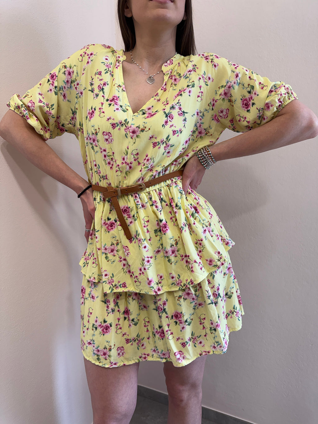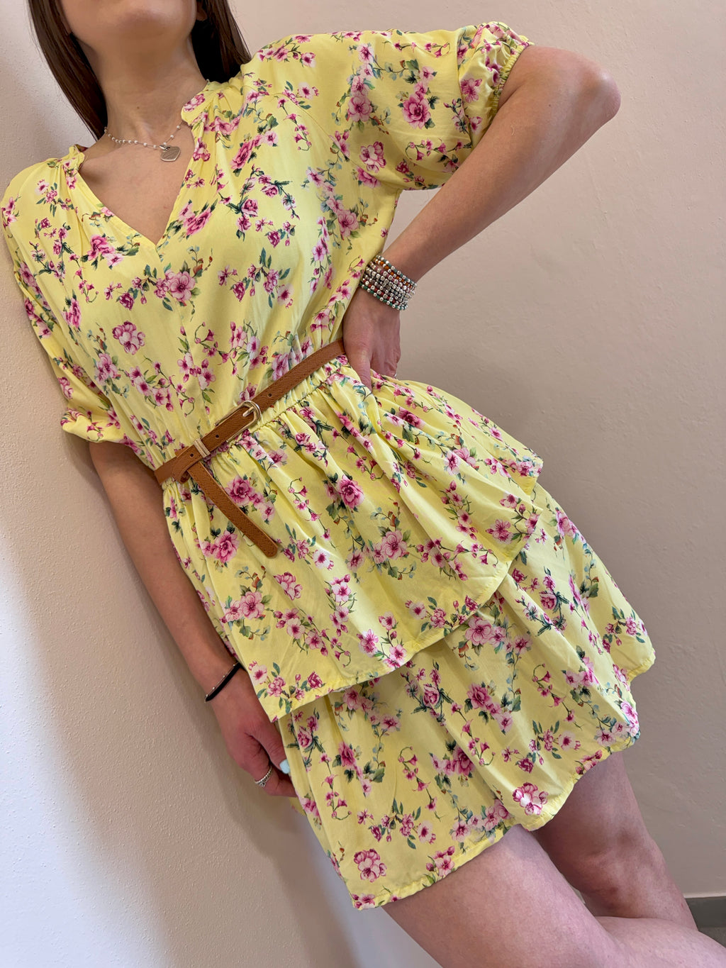 Abito midi con scollo a V alla coreana, cinturina in eco pelle compresa. Gonna con doppia balza e vita con elastico morbido. Super fresco e leggero per l’estate.