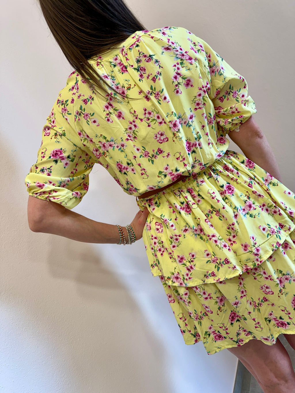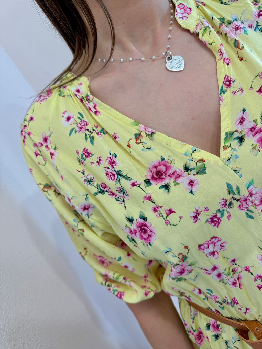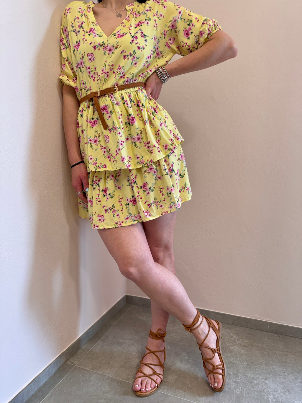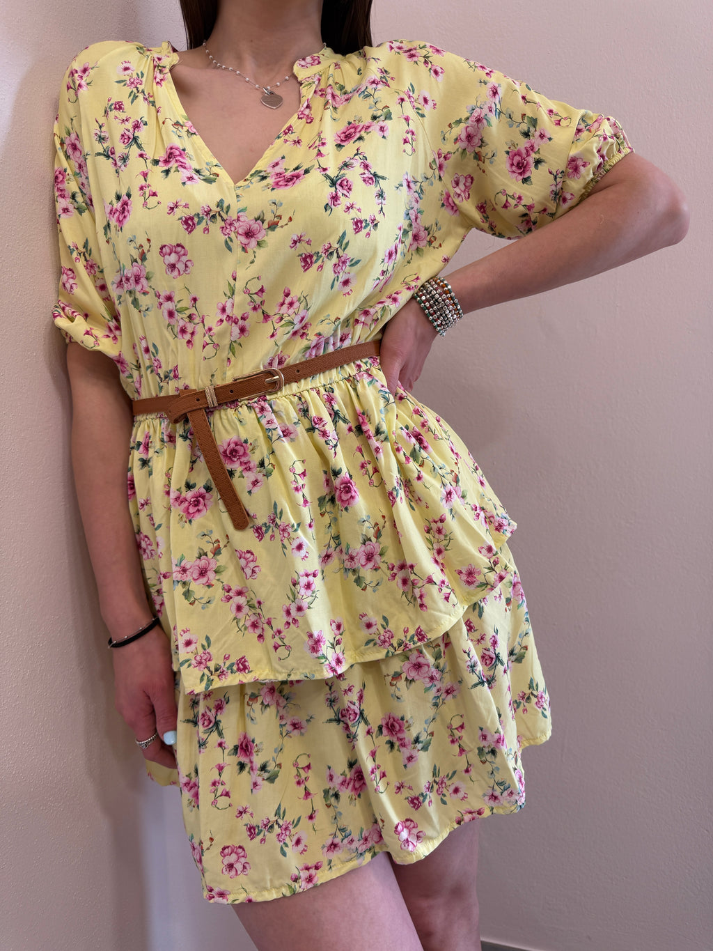 Abito midi con scollo a V alla coreana, cinturina in eco pelle compresa. Gonna con doppia balza e vita con elastico morbido. Super fresco e leggero per l’estate.