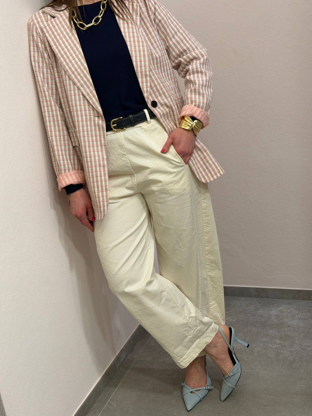 Aggiungi un tocco di romanticismo metropolitano al tuo outfit con questo blazer firmato Kontatto. Il classico motivo a quadretti vichy viene declinato in una delicata tonalità rosa pesca, perfetta per illuminare le giornate primaverili.