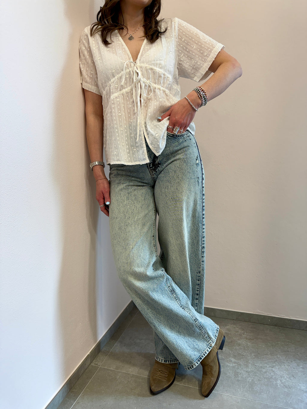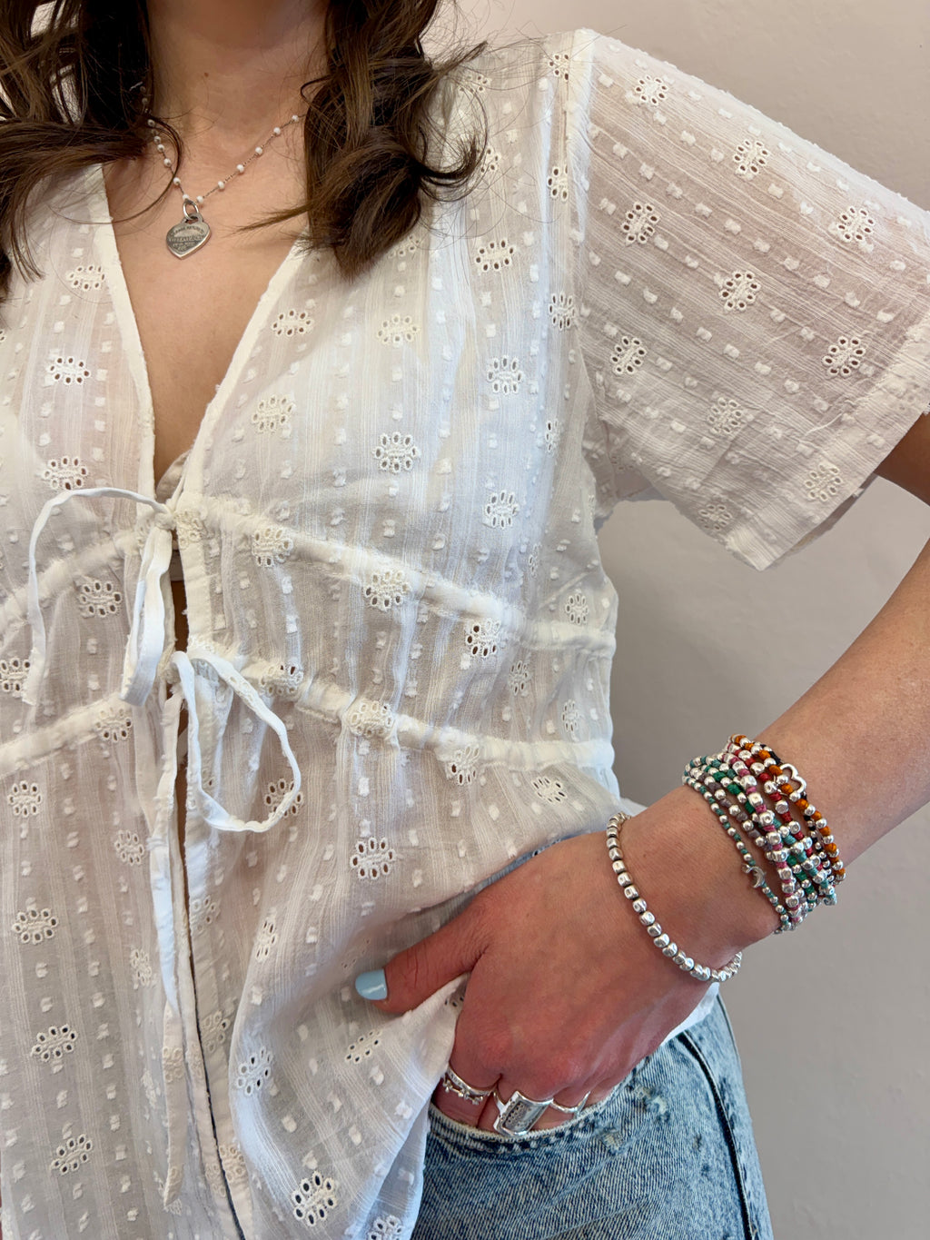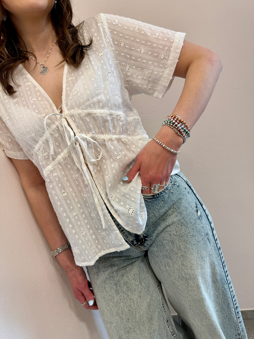 Camicetta  Talia  con il suo taglio dritto e fantasia ricamata. scollo a V, maniche corte e lacci da annodare davanti che conferiscono leggerezza e femminilità.