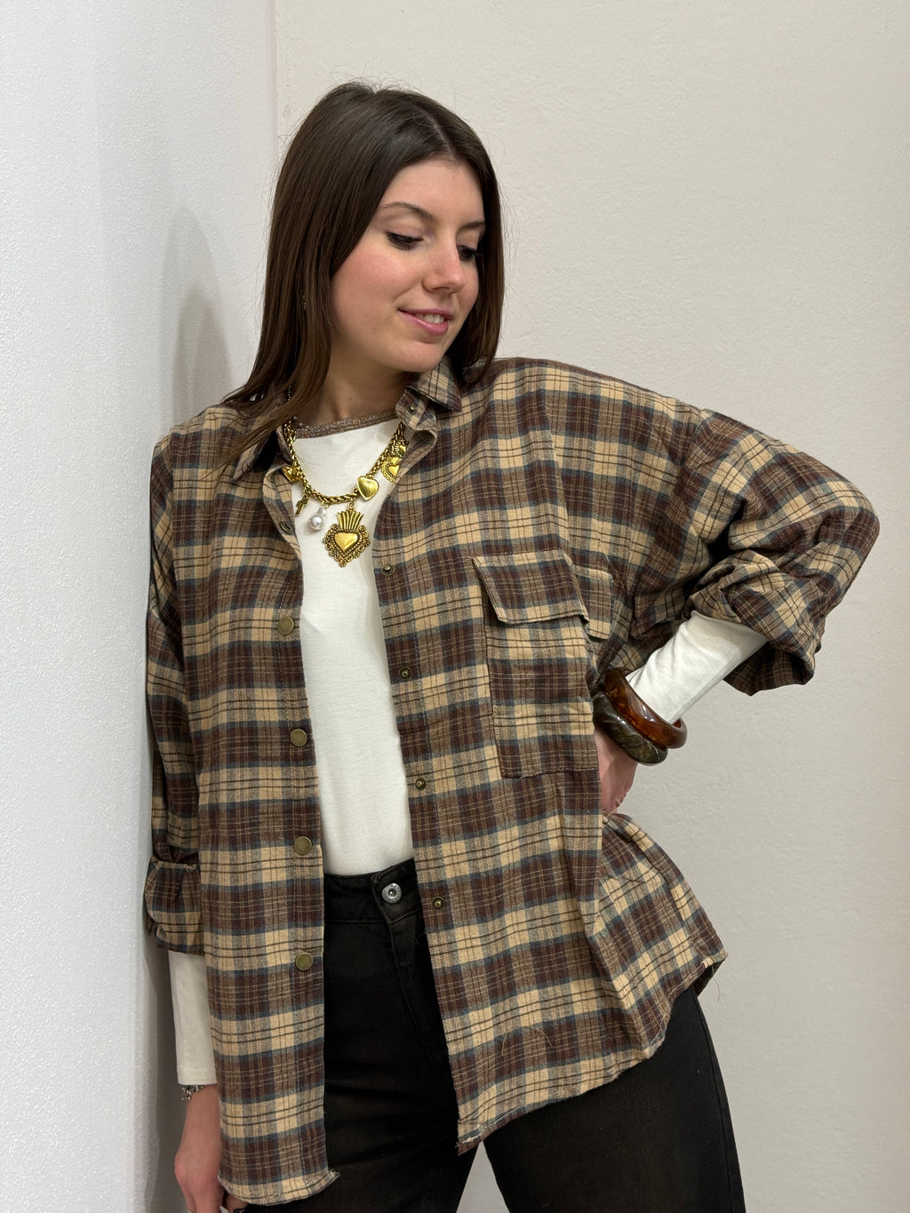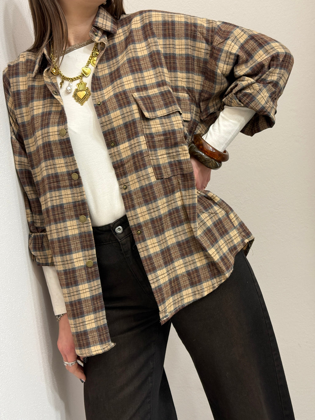 Camicia in panetto di cotone caldo fest morbido con spalla ascesa. Chiusura con bottoni automatici, tasca compatta sul davanti.