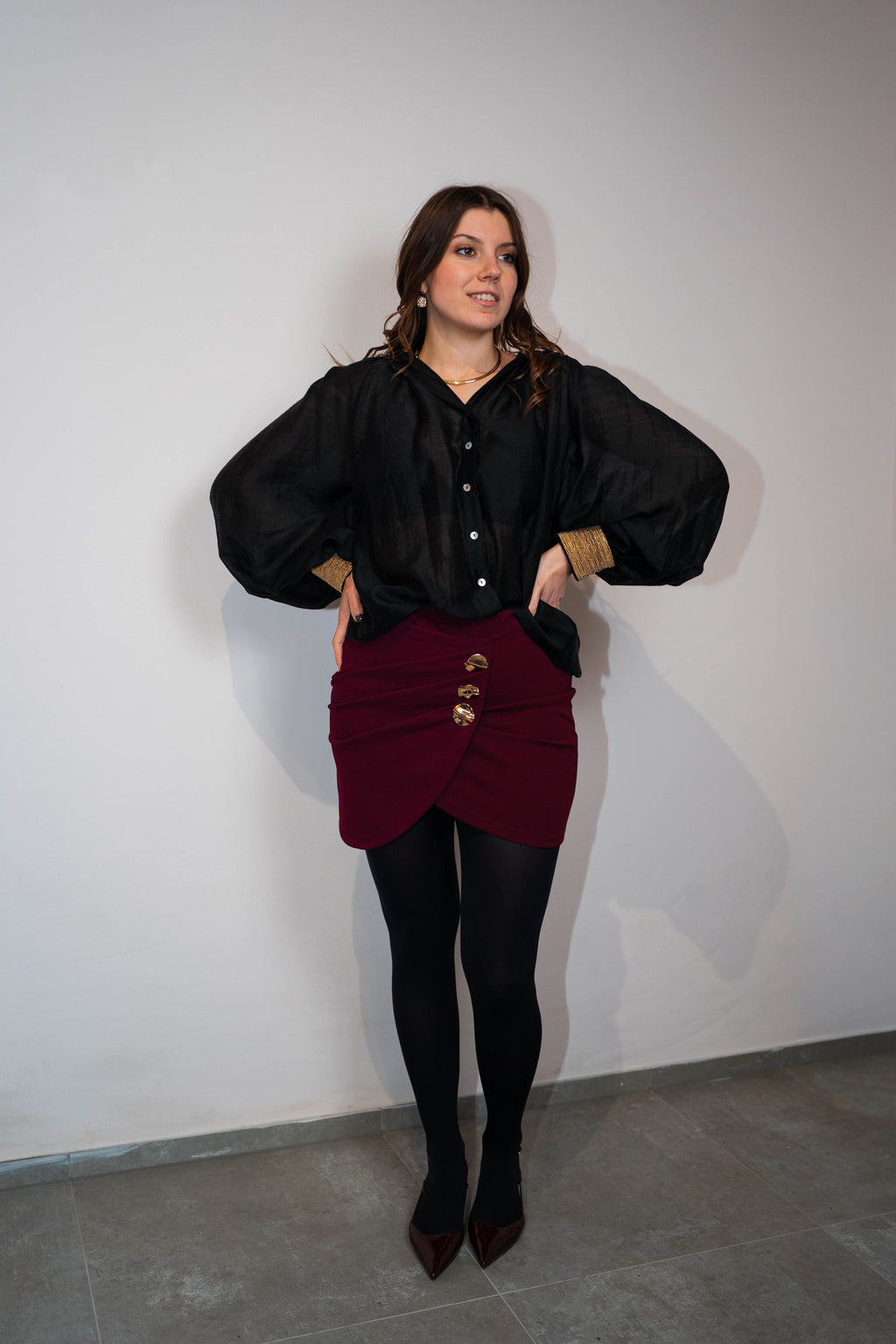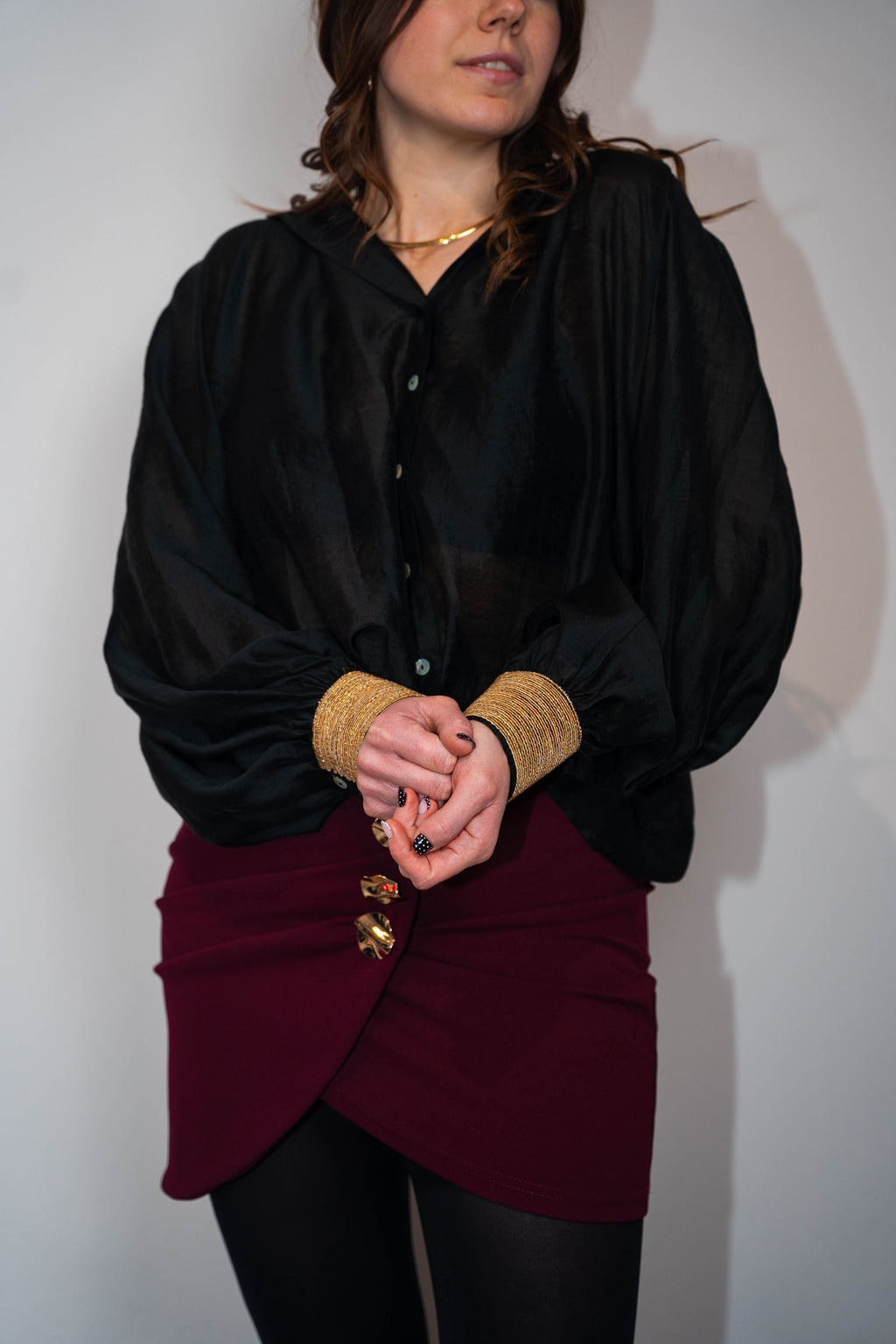 Camicia semitrasparente con scollo a V profondo. Chiusura con bottoni madreperla.particolare per il suo polsino ricamato e infili lurex e manica balloon. Collana in ferro rigido, oro compresa.