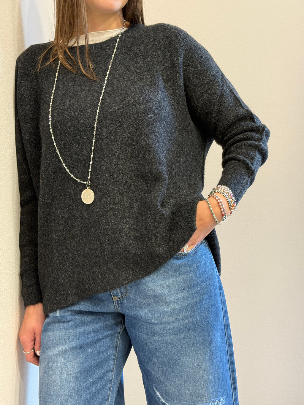 Maglione in misto lana e viscosa calda e morbida. Spacchetti laterali. Scollo a barca. Fit morbido