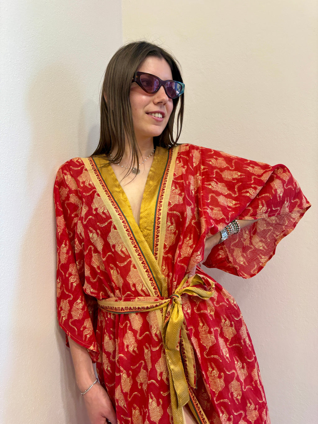 Il kimono con stampa animalier presenta collo sciallato con fusciacca tono su tono e spacchi laterali.