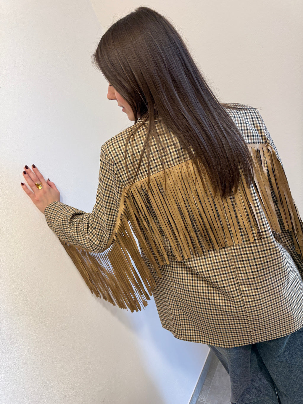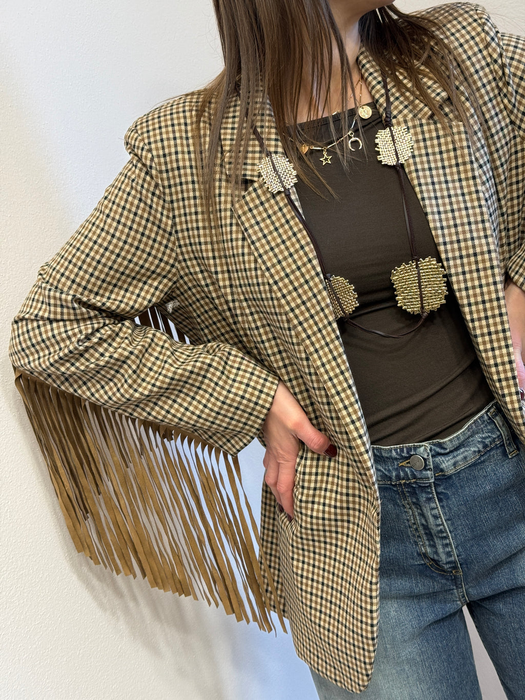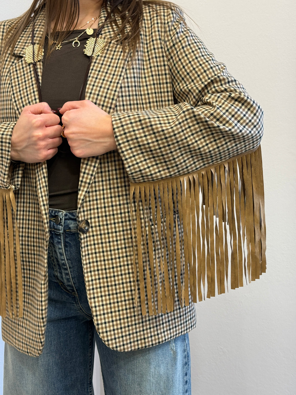 Blazer fantasia check cammello . Modello chiusura frontale monopetto. Dettaglio di frange e tasche a filetto laterali.