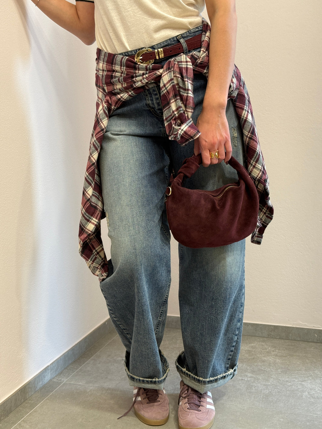 Borsa in pelle suede dalla forma a mezza luna, impreziosita dal caratteristico manico con nodo che ne esalta lo stile contemporaneo. La tracolla rimovibile in tono permette di indossarla sia a mano che a spalla, mentre la chiusura con zip assicura praticità e sicurezza. Un accessorio versatile e raffinato, perfetto dal giorno alla sera.