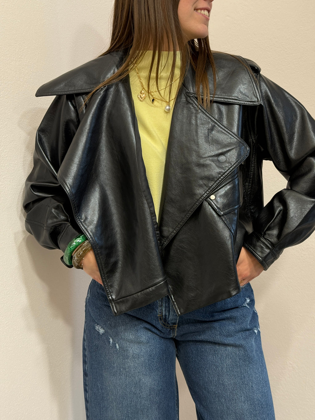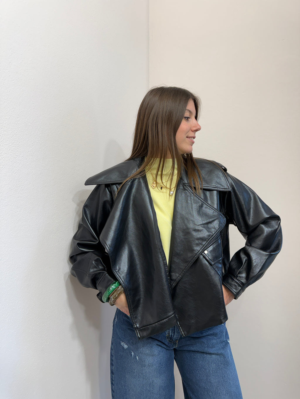 Chiodo in ecopelle nera morbidissima. Modello lunghezza in vita, colletto revers , chiusura con gancio e bottone laterale.manica morbida .