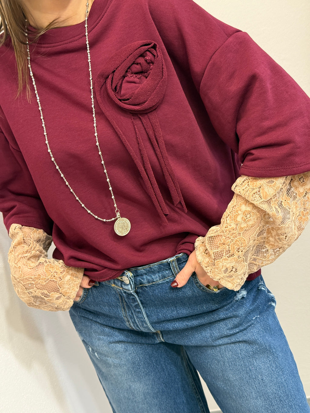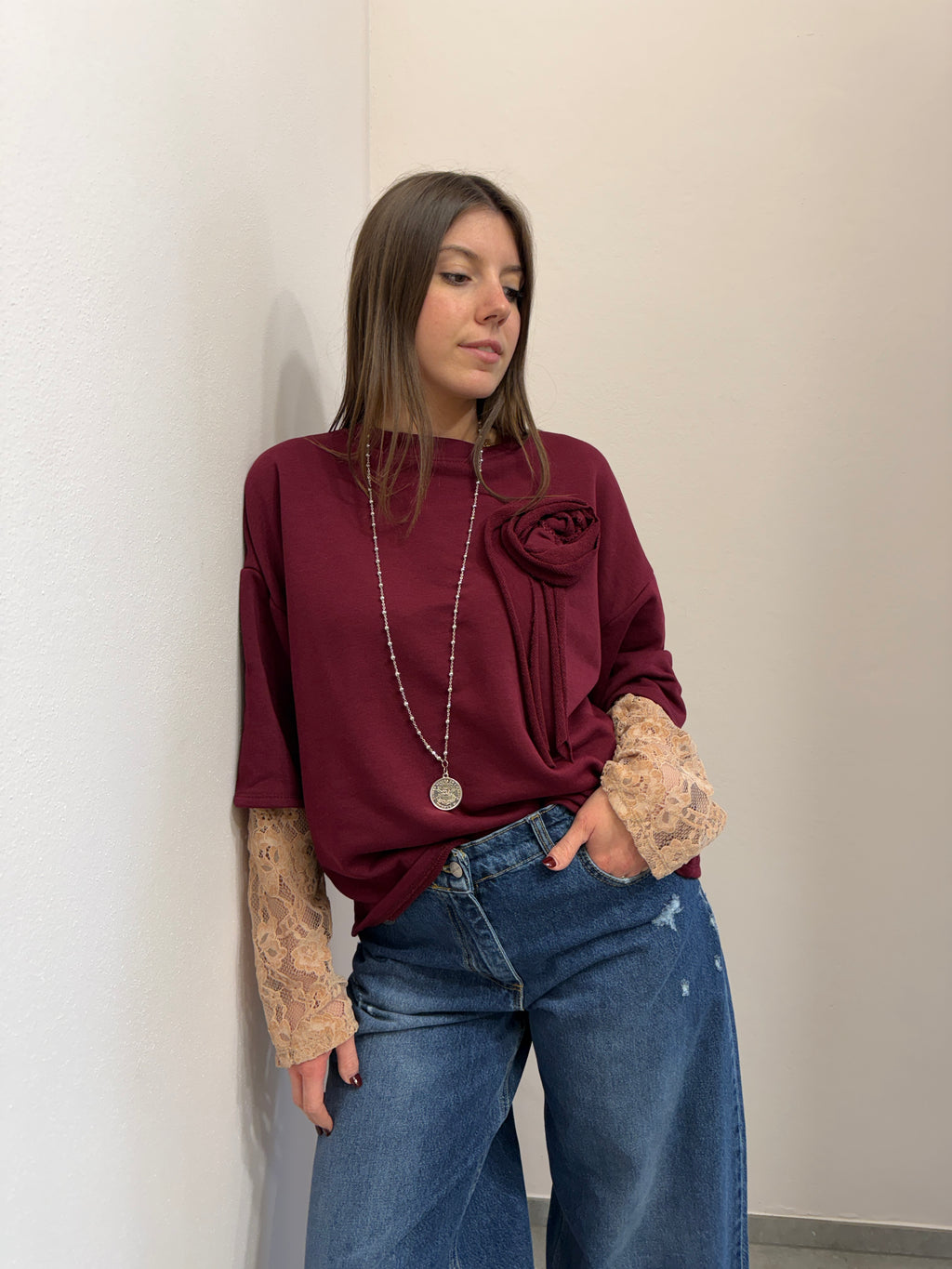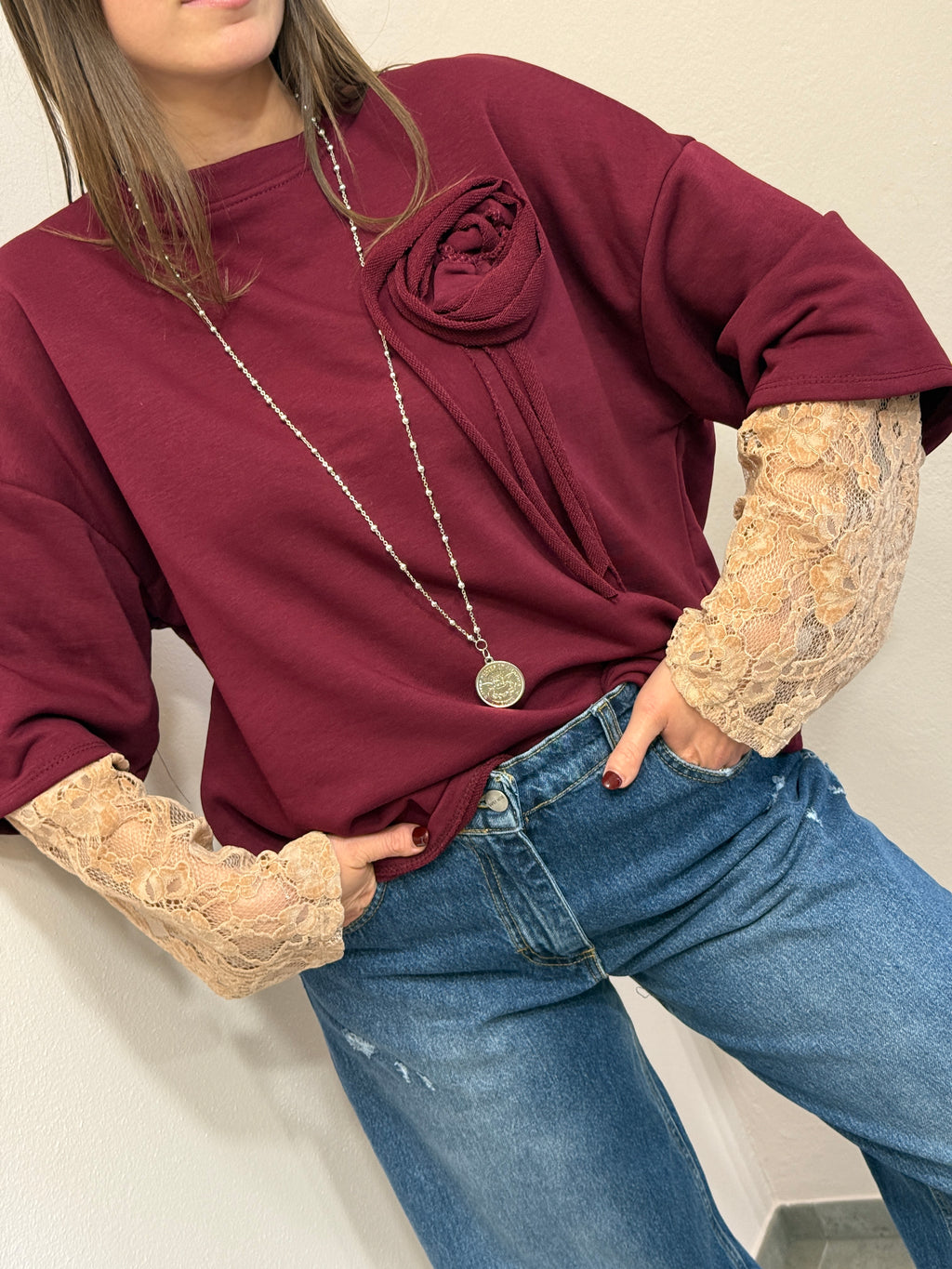 Felpa over color bordeaux , con fiore cucito lateralmente. Maniche con inserto di pizzo in velluto color rosa cipria.