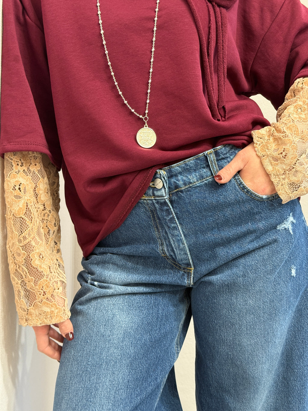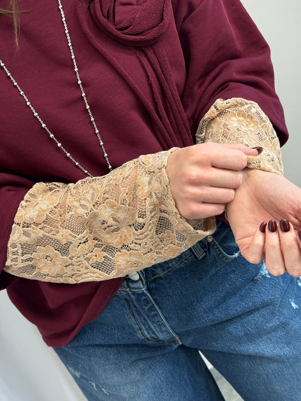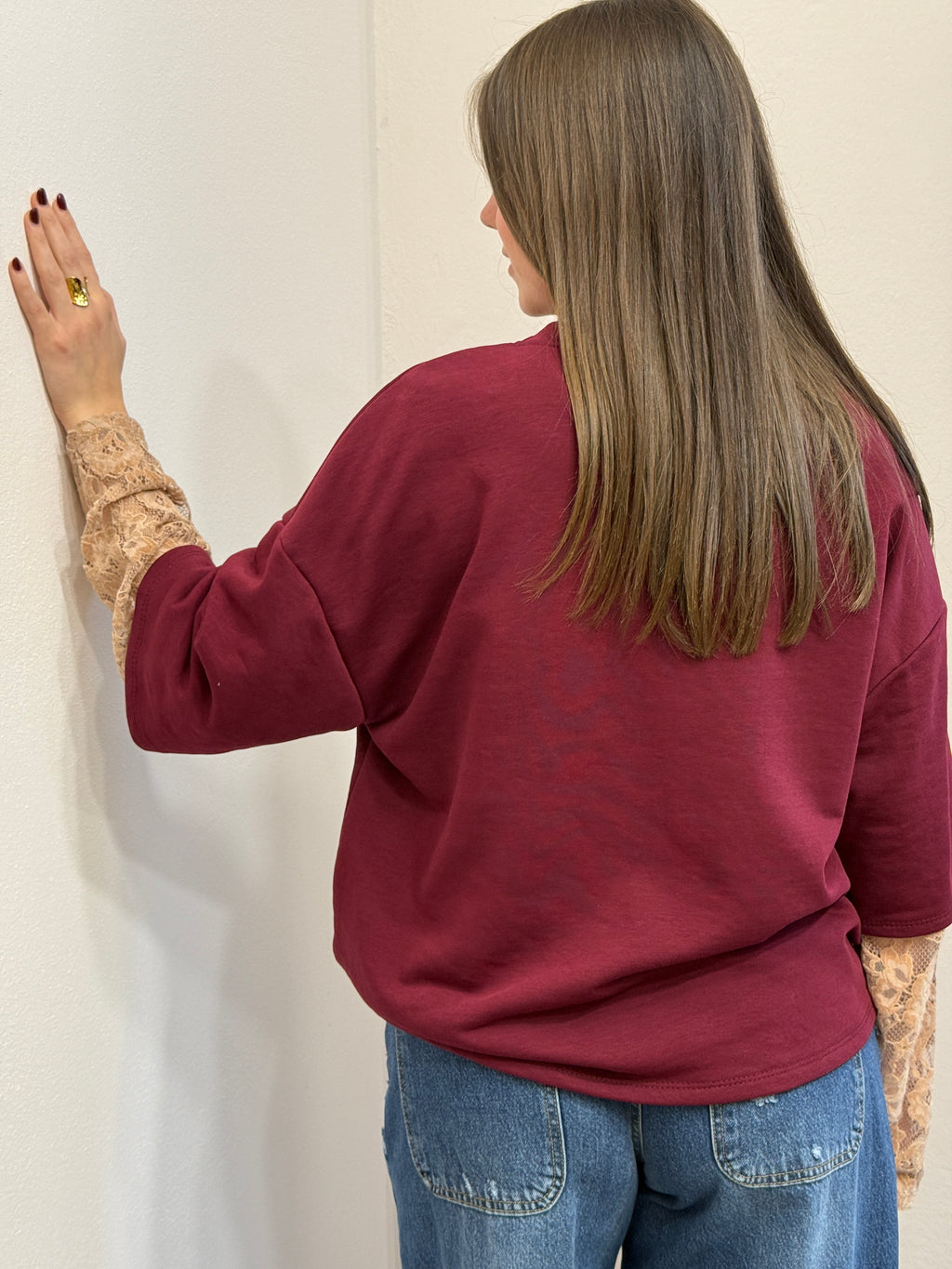 Felpa over color bordeaux , con fiore cucito lateralmente. Maniche con inserto di pizzo in velluto color rosa cipria.