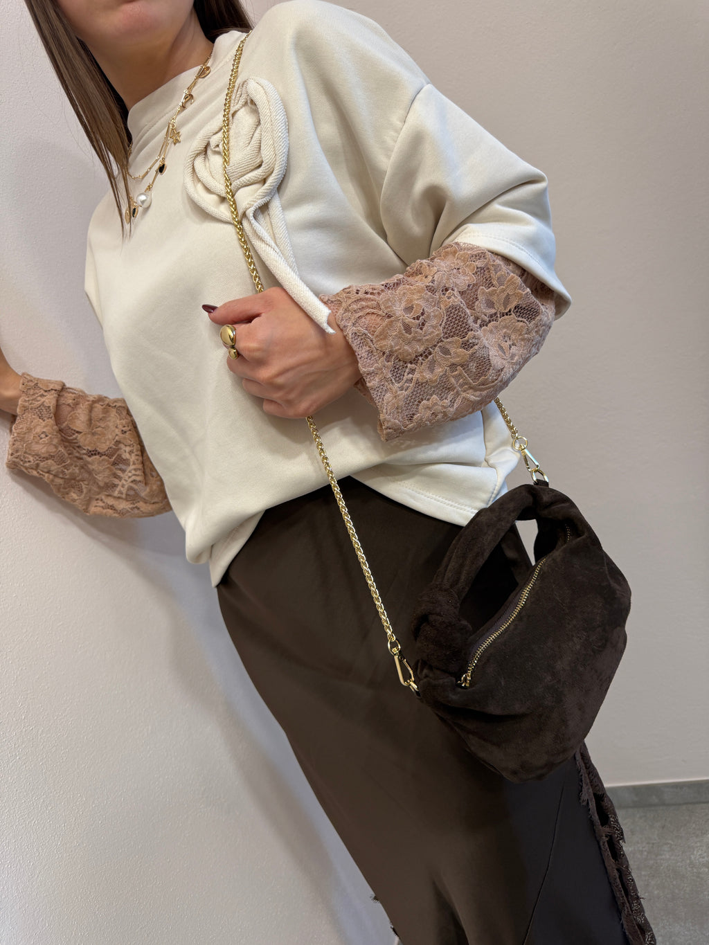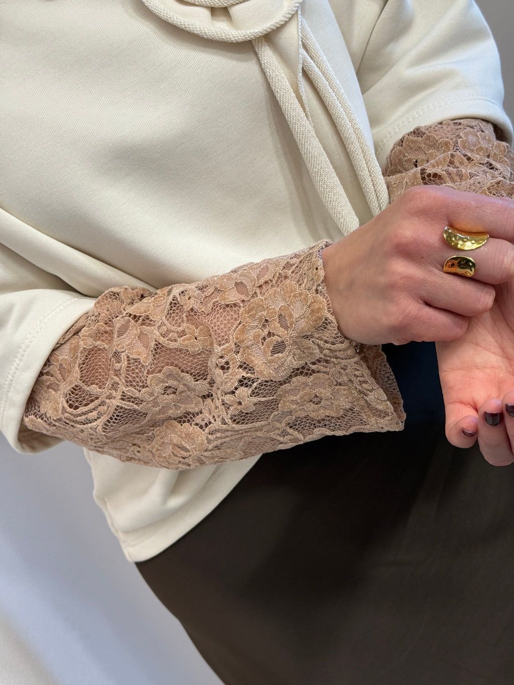 Felpa over color panna, con fiore cucito lateralmente. Maniche con inserto di pizzo in velluto color rosa cipria.