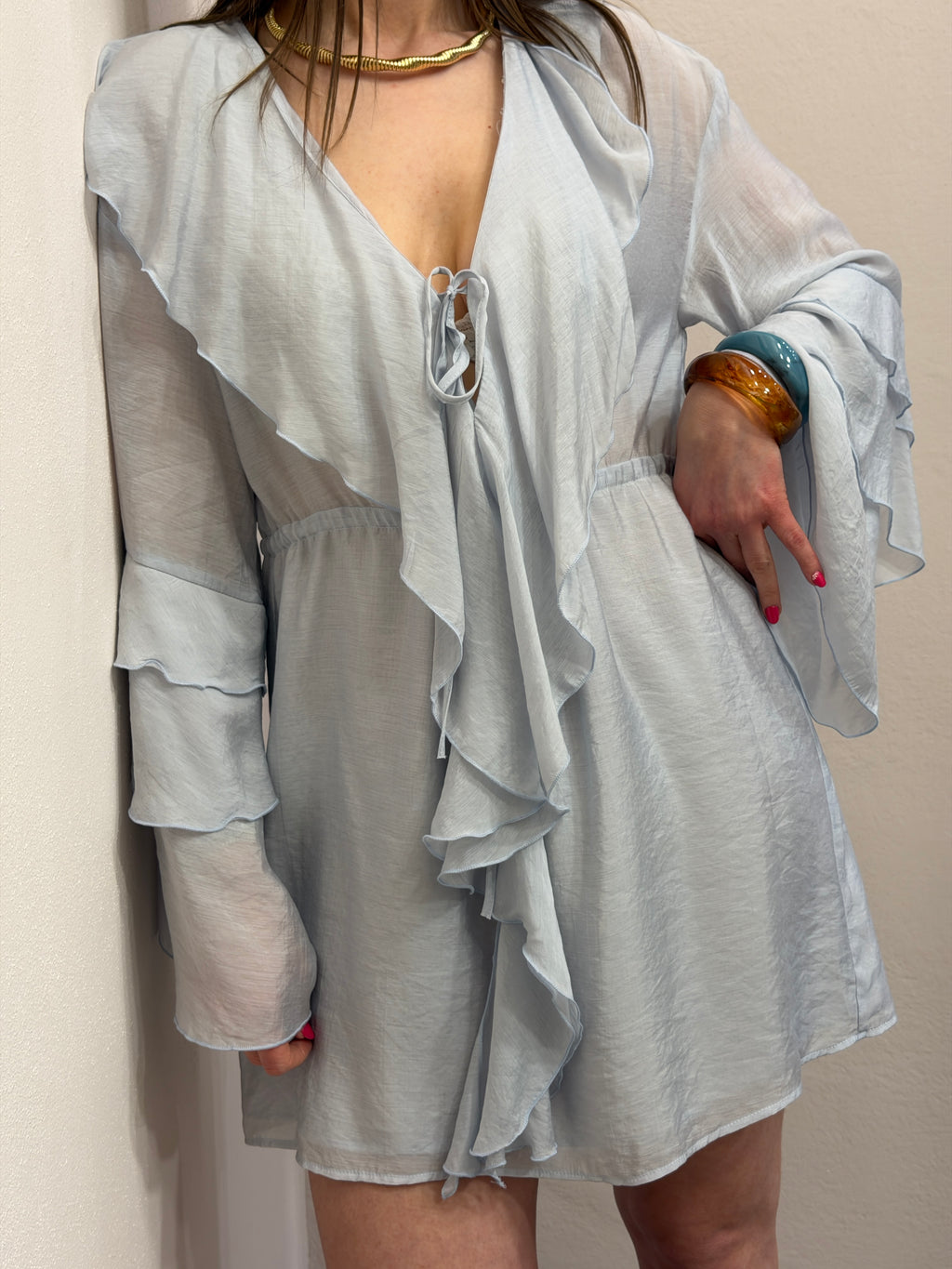 Eleva il tuo stile con questo incantevole abito corto in una delicata tonalità celeste polvere. Un capo che unisce freschezza e ricercatezza, ideale per chi ama i look romantici dal carattere decISO.