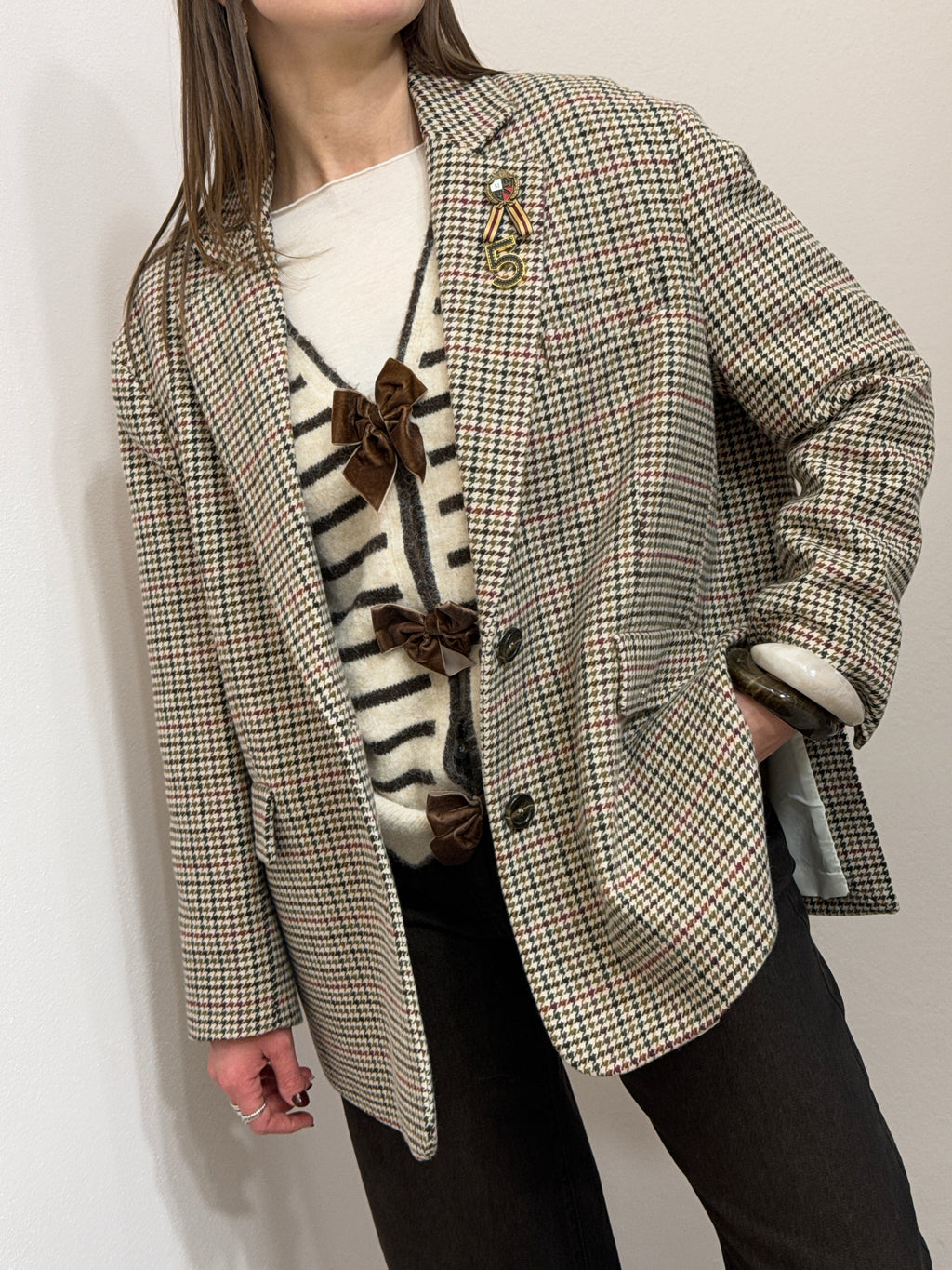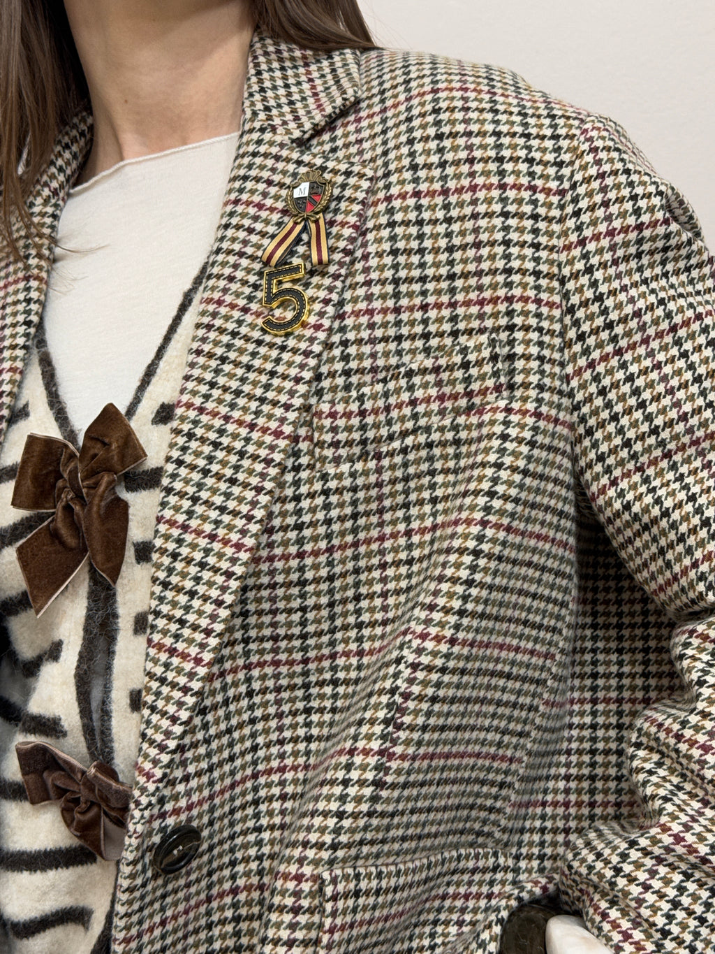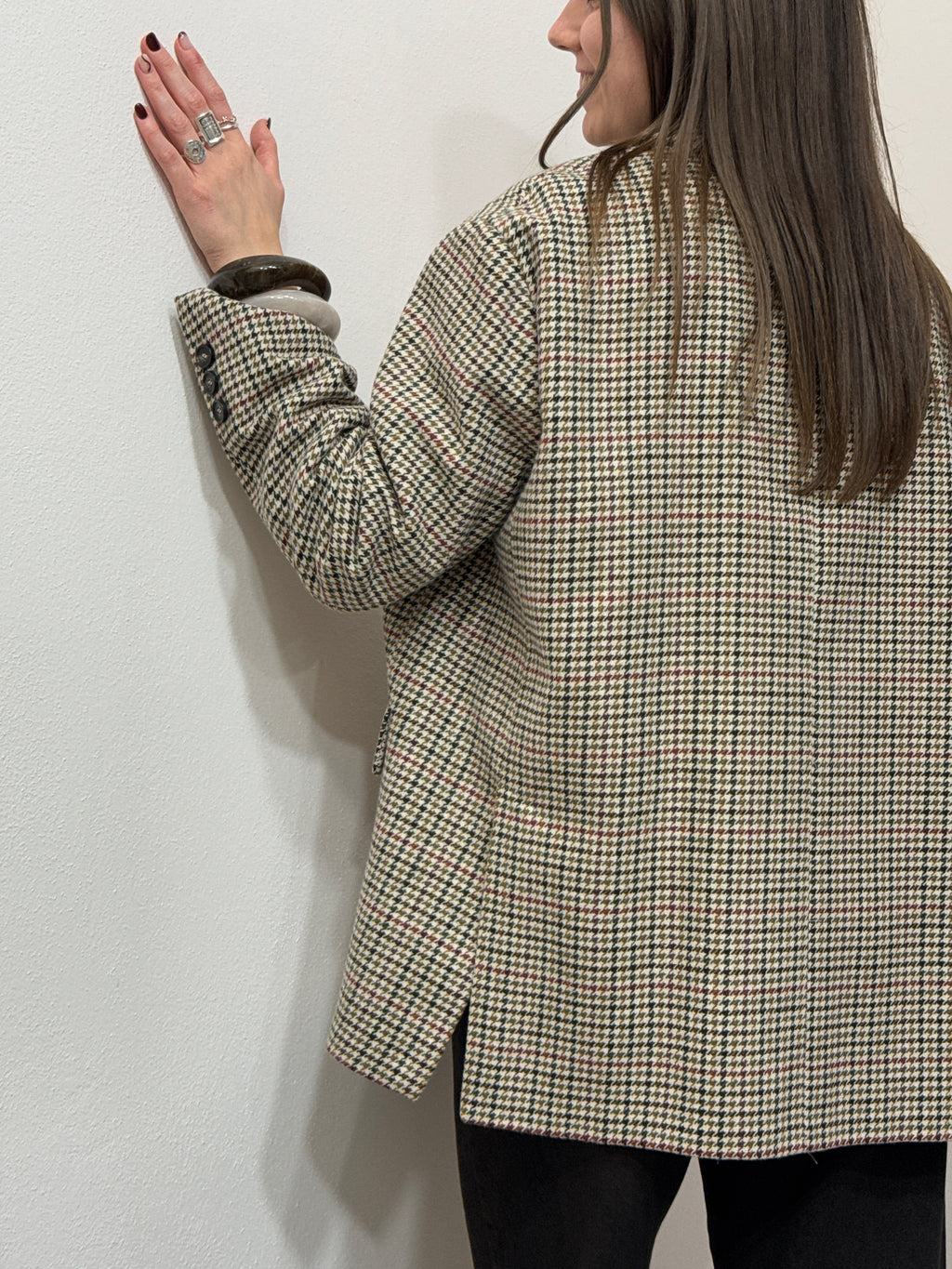 Giacca fantasia, mix verde, tabacco bordeaux e nero su base avorio. Fodera interna. Particolare per le sue due spille a lato tasche compatta, chiusura con bottoni tartaruga.