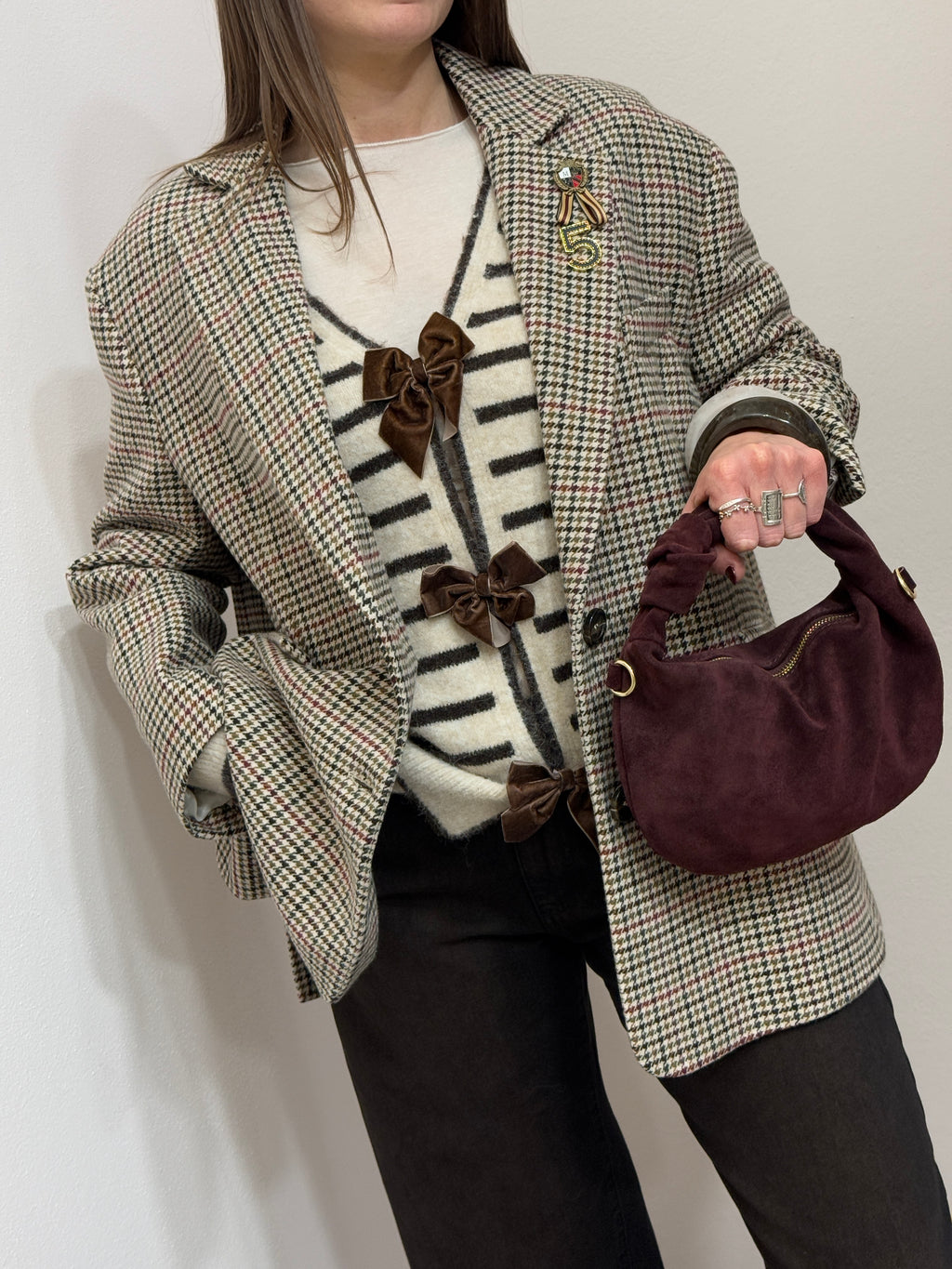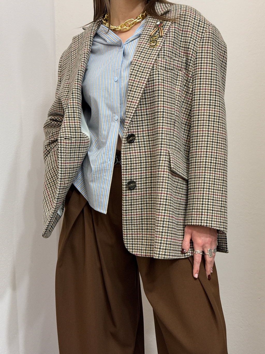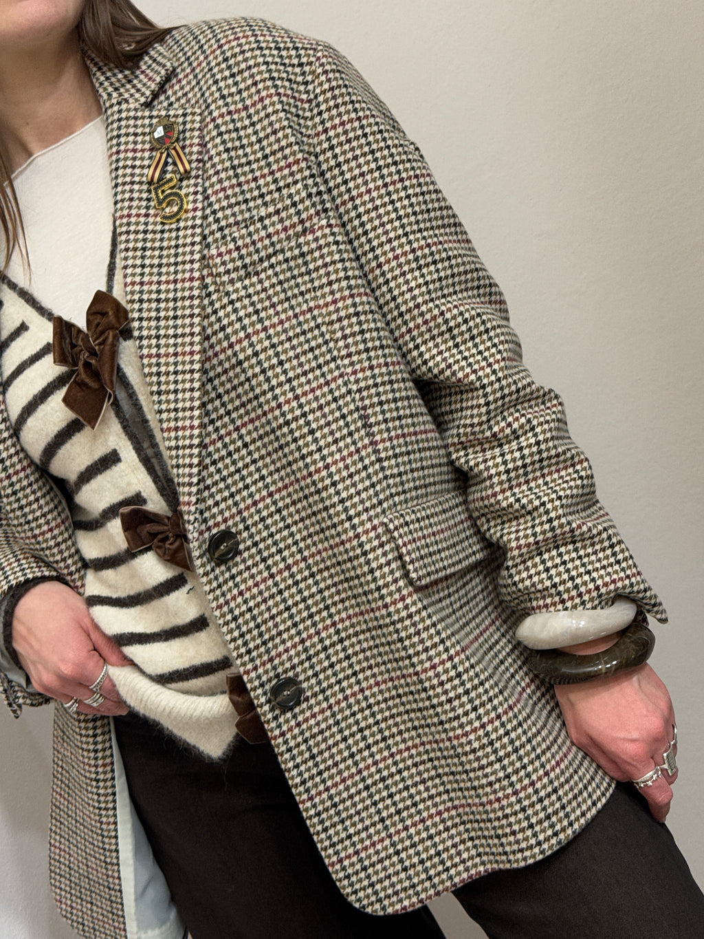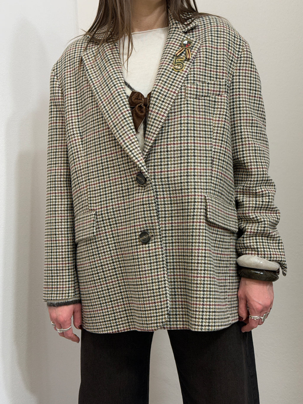 Giacca fantasia, mix verde, tabacco bordeaux e nero su base avorio. Fodera interna. Particolare per le sue due spille a lato tasche compatta, chiusura con bottoni tartaruga.