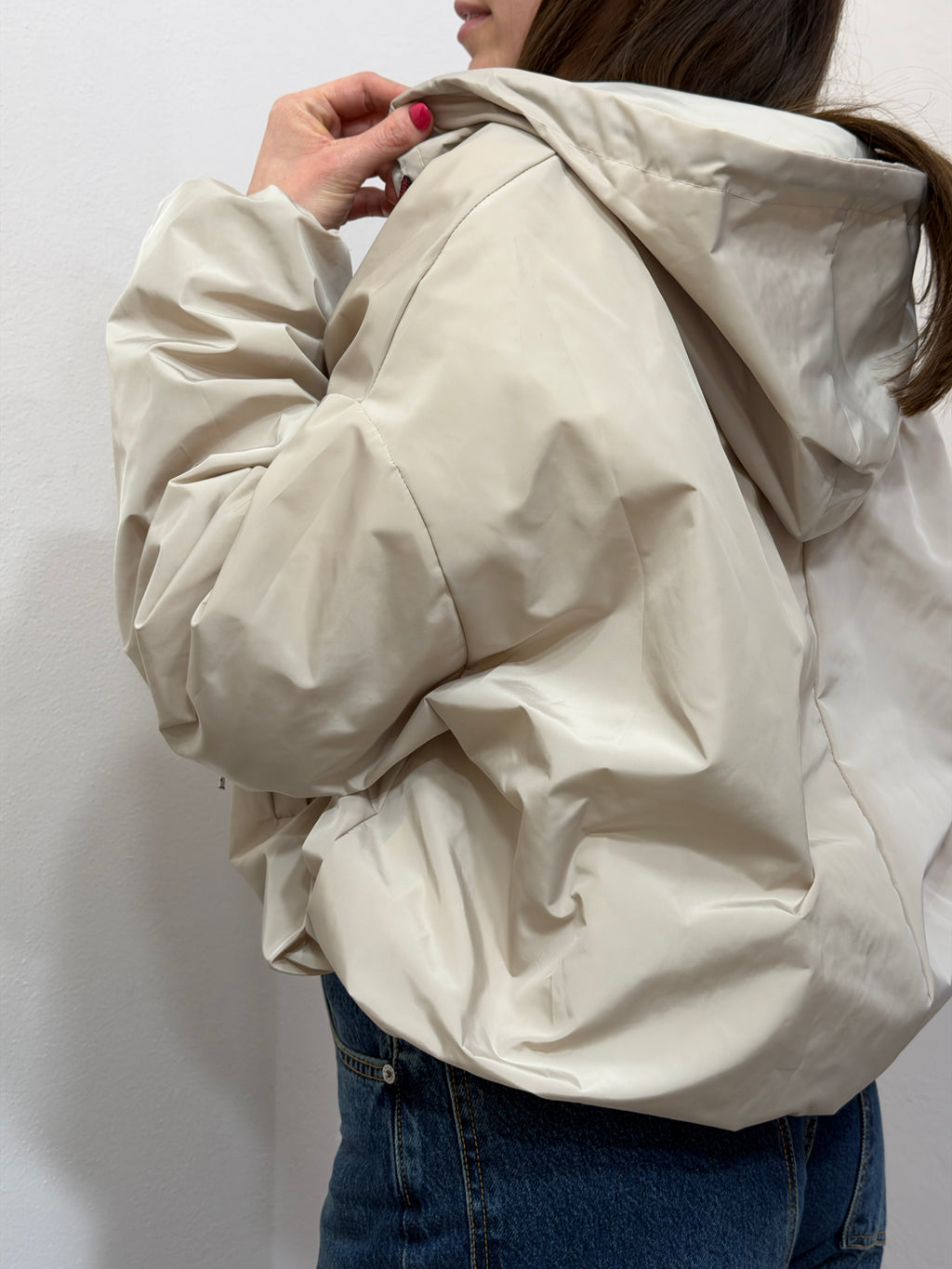 Dettagli: Chiusura frontale con zip argentata, cappuccio regolabile con coulisse a contrasto (nero/rosso) e finiture elasticizzate su polsi e fondo per un volume moderno.